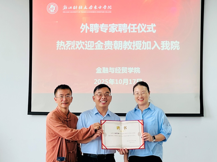 活动伊始,我院为金贵朝教授颁发“金融与经贸学院教授”聘书,金贵朝教授与我院副院长李乐、跨境电商系主任王恩江合影留念。此次聘请旨在进一步深化产教融合,依托行业专家的实践经验,为学院跨境电商、国际贸易专业人才培养注入更多前沿资源,助力学生衔接行业实际需求、提升岗位适配能力。