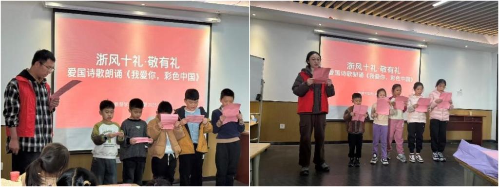 活动最后,全体小朋友与大学生志愿者齐声完整朗诵《我爱你中国》并合影留念。这场浸着“浙风有礼”与家国情怀的活动也落下帷幕。小朋友们或许还不能完全读懂诗句里的深沉,但眼底的光亮、掌心的温度,早已将“热爱”二字悄悄刻进心里;而这份跨越年龄的同频朗诵,也成了彼此记忆里一段温暖的注脚。