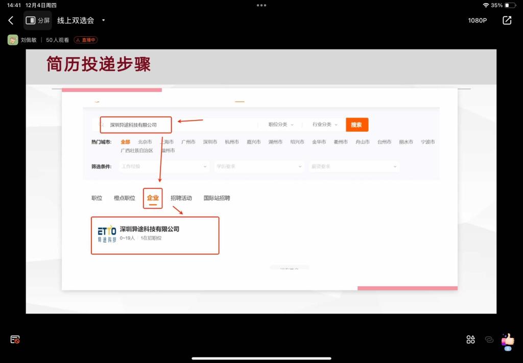此外,活动同步提供了择业面试建议,并清晰演示了简历投递步骤,指导学生通过“搜索企业名称-筛选对应岗位-完成投递”的流程,高效对接意向企业。