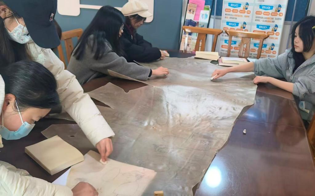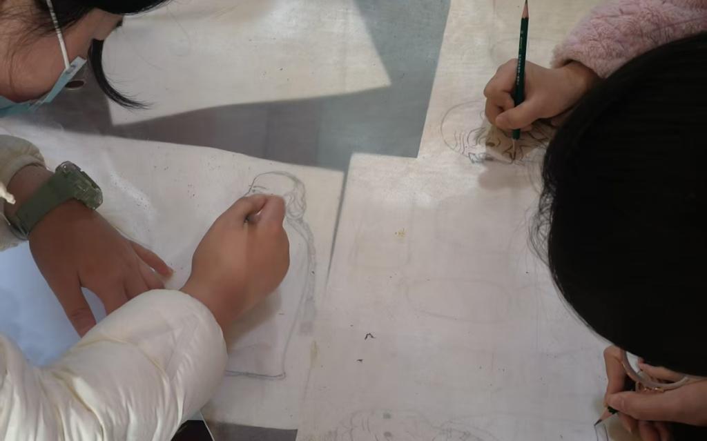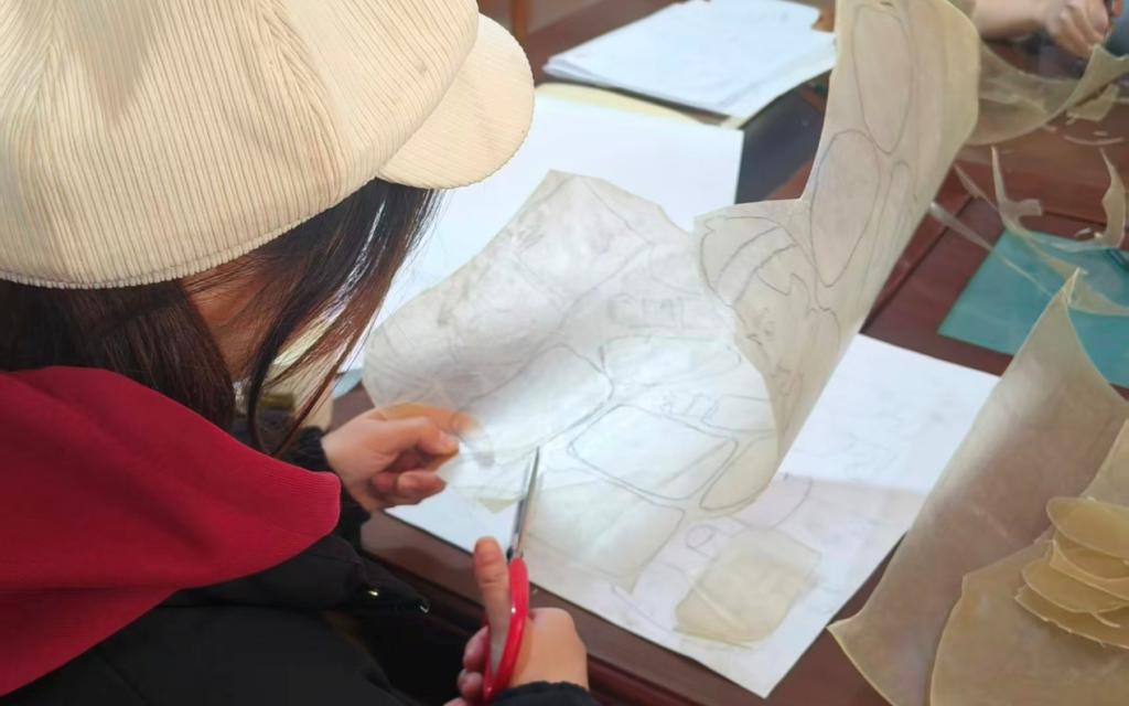 过稿环节,同学们将首期构思的创意画稿覆于处理好的干牛皮之上,借助透光工作台的均匀光线复刻轮廓。牛皮的韧性与透光性对下笔力度、线条精度提出高要求,大家反复调整、细心擦改,力求每一处纹饰、轮廓都与原稿完美契合,专注身影定格成非遗传承的鲜活画面。
