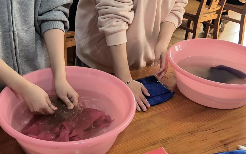 雕刻成型后,清洗环节紧随其后。为去除牛皮上的浮尘与笔痕,确保后续上色均匀、长久保存,同学们在老师指导下,将皮影部件分批轻柔漂洗、小心擦拭,既保证洁净度,又避免损伤牛皮肌理 —— 这一看似简单的工序,尽显传统工艺 “一丝不苟” 的匠心传承。