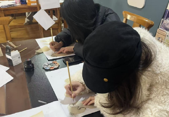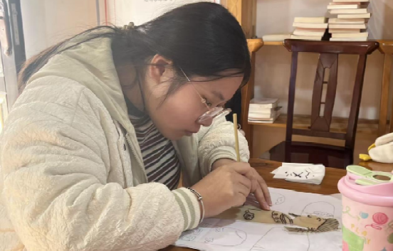 理论铺就基石,实践淬炼匠心。勾线环节,同学们伏案凝眸,将剪制完好的牛皮影偶覆于稿纸之上,借灯光勾勒轮廓,以细笔蘸取墨料,在坚韧的牛皮上缓缓游走。笔尖起落间,专注与敬畏交织,每一道线条都力求圆润流畅,每一处转折都饱含传统韵味,试图将海宁皮影的千年风骨,尽数镌刻于方寸皮料之上。