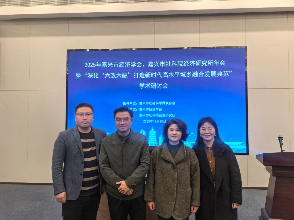 2025年12月20日,嘉兴市经济学会、嘉兴市社科院经济研究所2025年度学术年会在嘉兴市市委党校1号楼B403会议室成功召开。本次年会以“深化‘六改六融’,打造新时代高水平城乡融合发展典范”为主题,汇聚了来自嘉兴学界、政界68位专家与学者。我院金融与经贸学院李忠院长、经济系毛小敏老师、财税学院税务系主任朱计老师、高伟华老师应邀出席,参与了学会的学术交流与工作研讨,彰显了我院服务地方经济社会发展的主动作为。